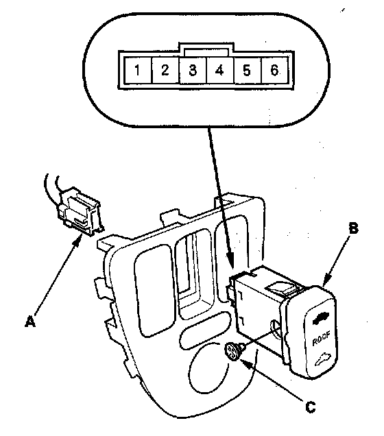2. Disconnect the 6P connector (A) from the moonroof switch (B), then remove the switch.