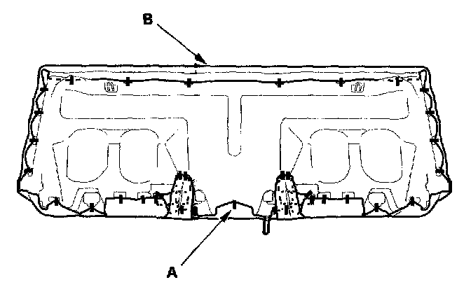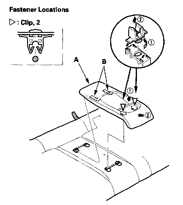 2. Pull up the front edge of the seat cushion center tray (A) to release the clips, and release the hooks (B), then remove the tray. If necessary, remove the clips from the tray.