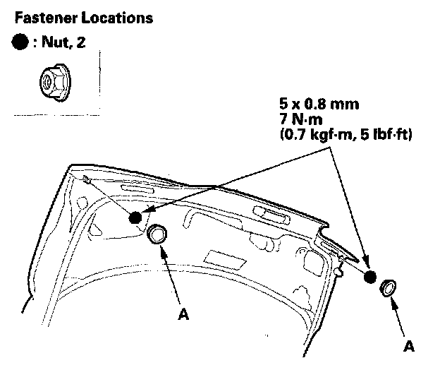 2. From inside the hatch, remove the plug caps (A) from both sides, then remove the nuts,