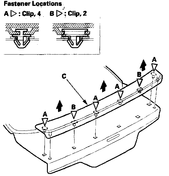 3. From inside the hatch, release the clips (A, B) while pulling up on the hatch spoiler (C). Take care not to scratch the hatch while removing the spoiler.