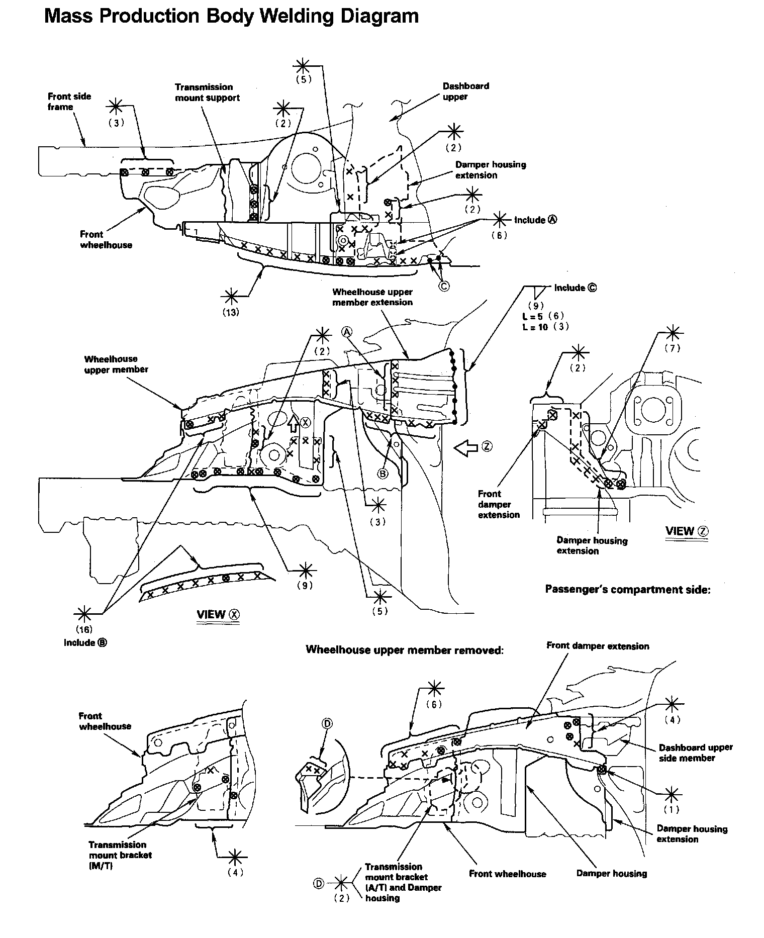 - Weld the front wheelhouse, damper housing, and front side frame.