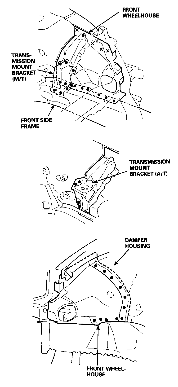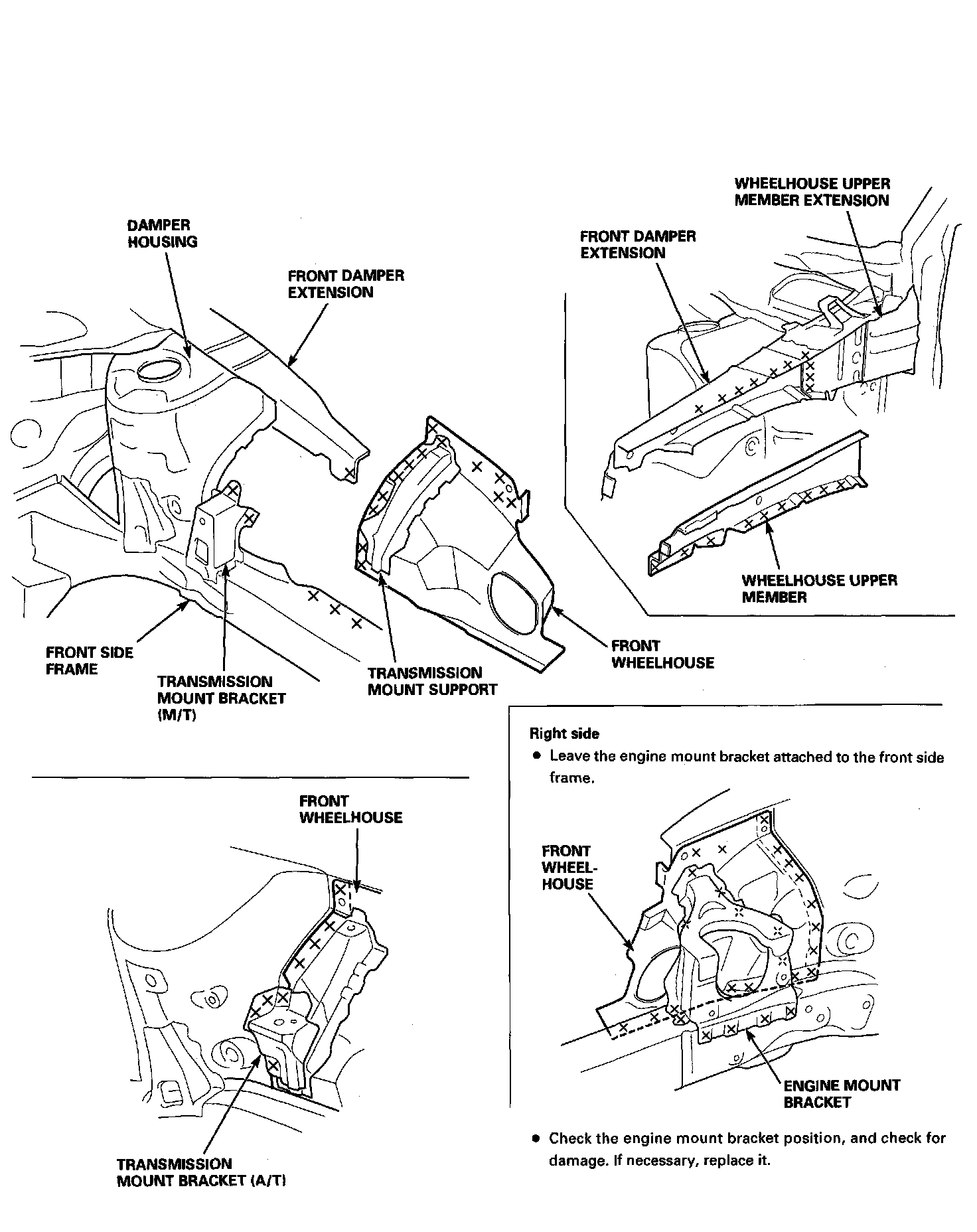 A/T: When replacing the wheel house and transmission mount bracket, support as an assembly.