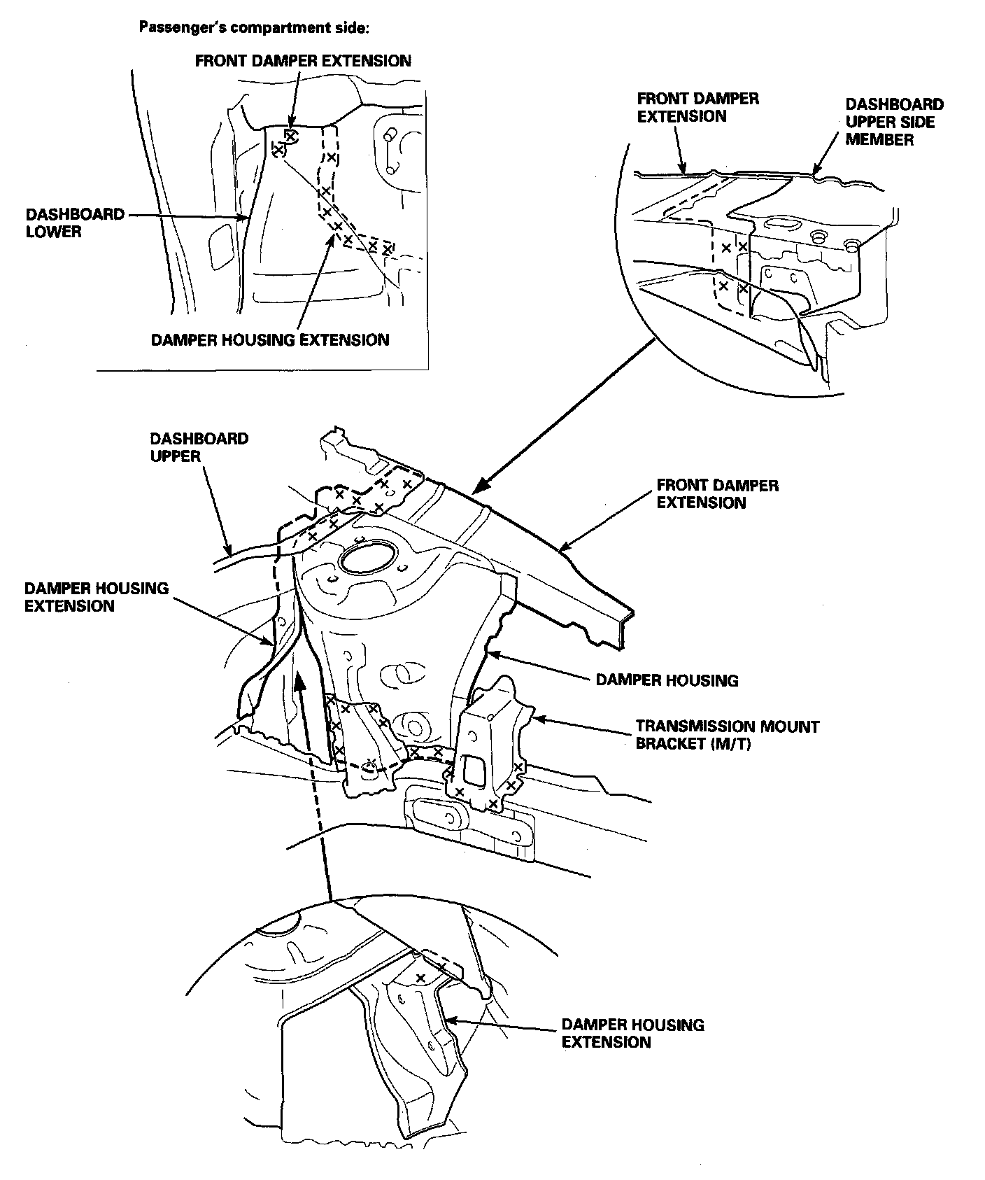 - From the passenger's compartment side, plug weld the holes in the dashboard lower, front damper extension and damper housing extension.