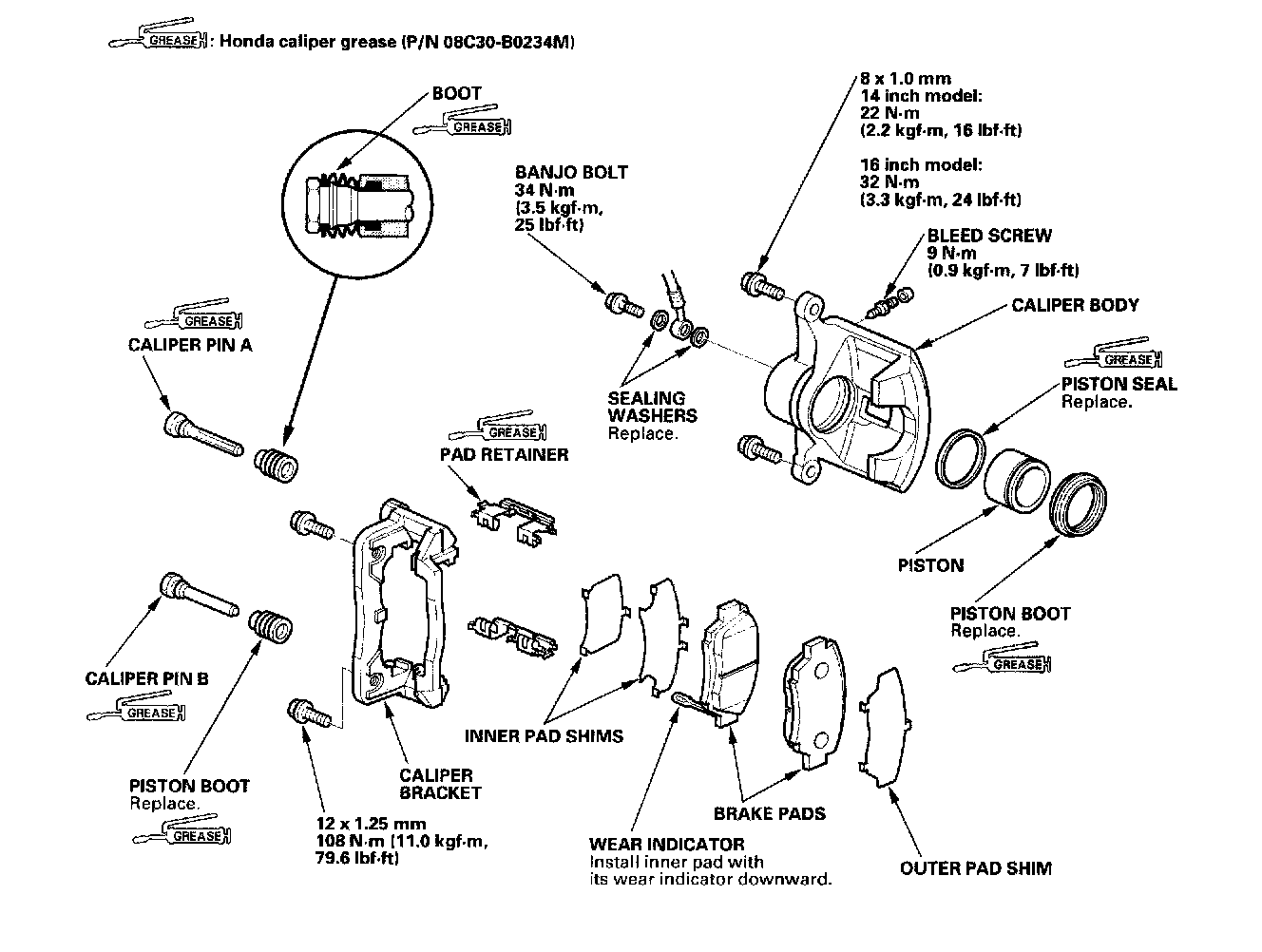 Front Brake Caliper OverhaulCAUTION: Frequent inhalation of brake pad dust, regardless of material composition, could be hazardous to your health.