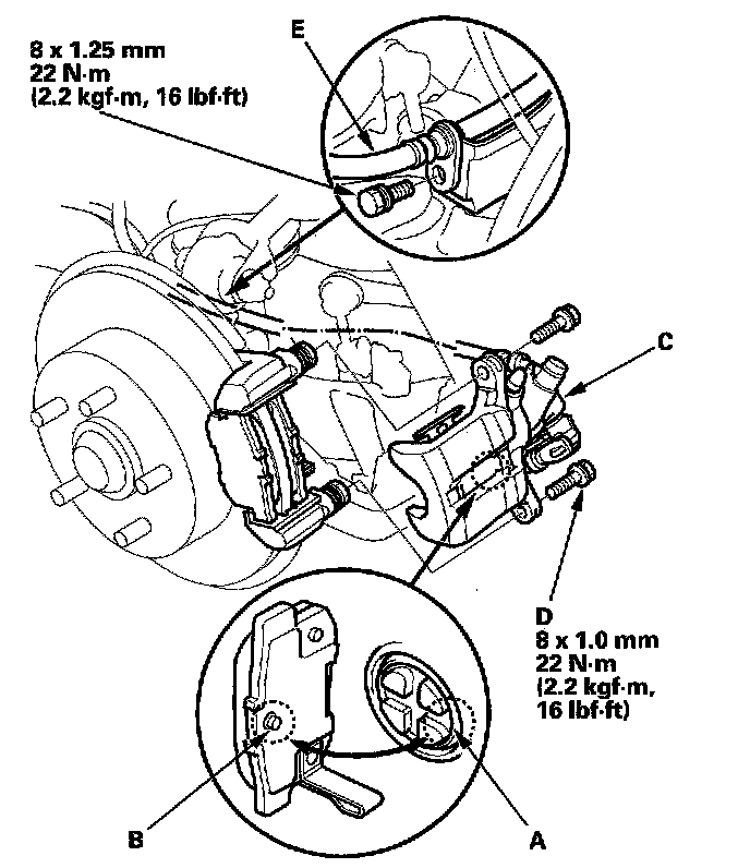 2. Remove the caliper bolts (C), and remove the caliper (D) from the caliper bracket.