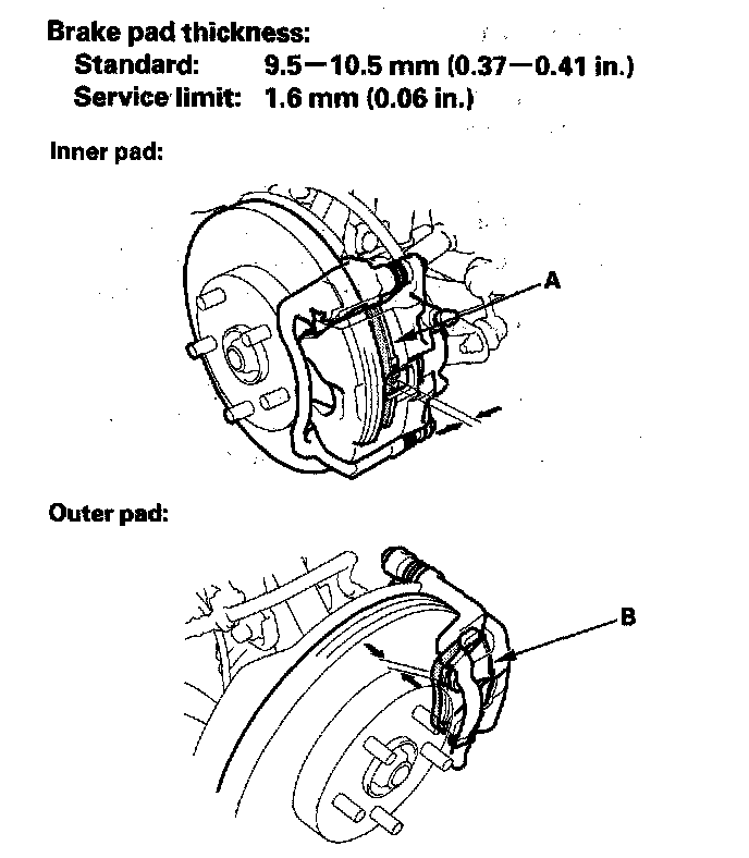 2. Check the thickness of the inner pad (A) and outer pad (B). Do not include the thickness of the backing plate.