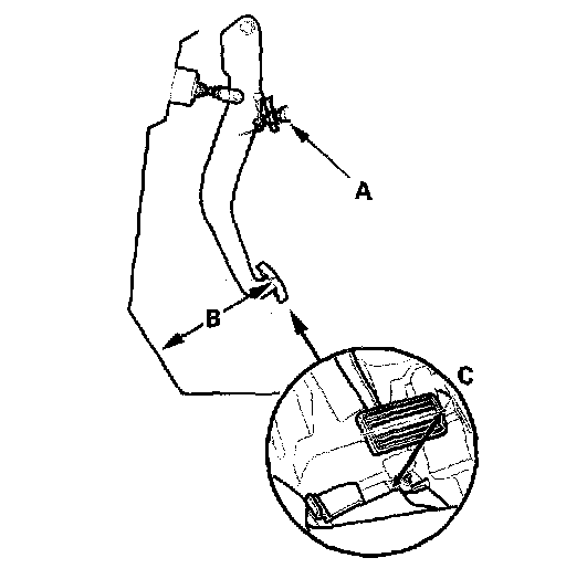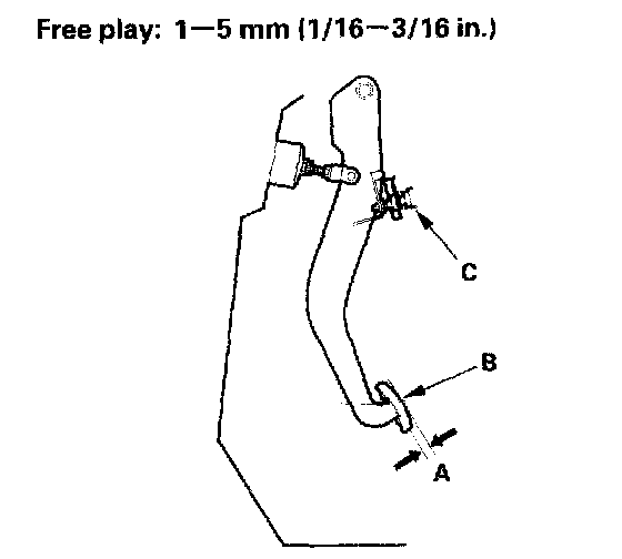 2. If the pedal free play is out of specification, adjust the brake pedal position switch (C). If the pedal free play is insufficient, it may result in brake drag.