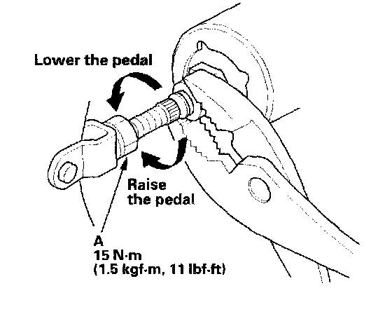 3. Loosen the pushrod locknut (A), and screw the pushrod in or out with pliers until the standard pedal height from the floor is reached. After adjustment, tighten the locknut firmly. Do not adjust the pedal height with the pushrod pressed.