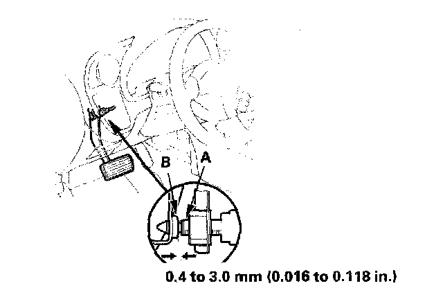 1. Push in the brake pedal position switch until its plunger is fully pressed (threaded end (A) touching the pad (B) on the pedal arm). Then, turn the brake pedal position switch 45° clockwise to lock it. The gap between the brake pedal position switch and the pad is automatically adjusted to 0.4 to 3.0 mm (0.016 to 0.118 inch) by locking the switch. Make sure the brake lights go off when the pedal is released.