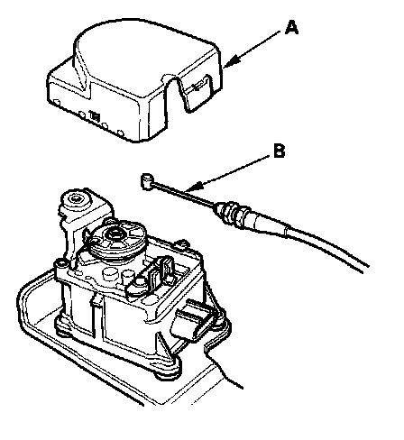 5. Remove the actuator cover (A), then remove the actuator cable (B) from the cruise control actuator,