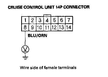 7. Connect a voltmeter between cruise control unit 14P connector terminal No. Sand body ground. Test-drive the vehicle at speeds over 25 mph (40 km/h) with the cruise control set, and watch the voltmeter.
