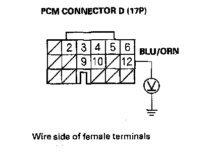 8. Connect a voltmeter between PCM connector terminal D12 and body ground. Drive the vehicle at speeds over 25 mph (40 km/h) with the cruise control set, and watch the voltmeter.