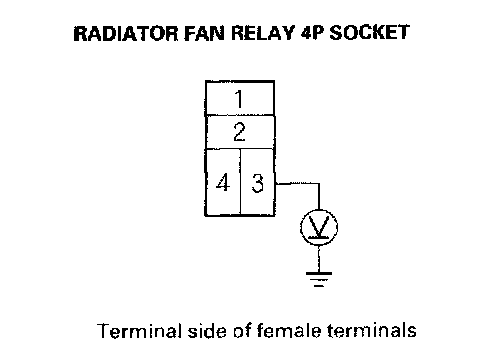 5. Disconnect the jumper, and turn the ignition switch ON (II). Check for voltage between the No. 3 terminal of the radiator fan relay 4P socket and body ground.