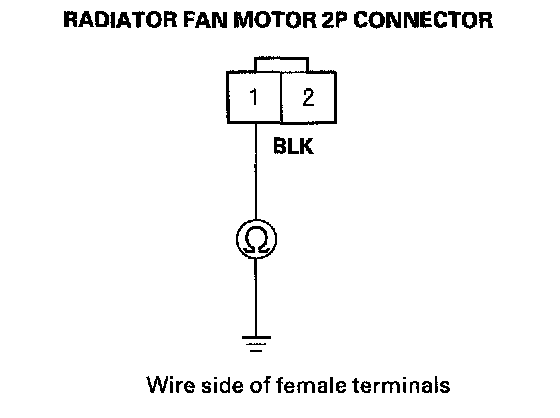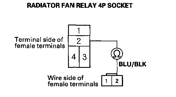 7. Check for continuity between the No. 2 terminal of the radiator fan relay 4P socket and the No. 2 terminal of the radiator fan motor 2P connector.