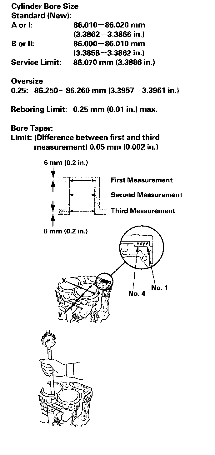 4. Measure wear and taper in direction X and Y at three levels in each cylinder as shown. If measurements in any cylinder are beyond the oversize bore service limit, replace the block. If the block is to be rebored, refer to step 7 after reboring.