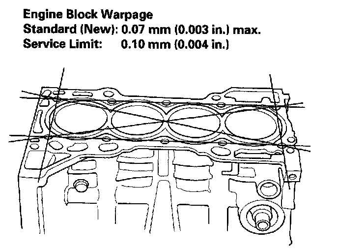6. Check the top of the block for warpage. Measure along the edges and across the center as shown.