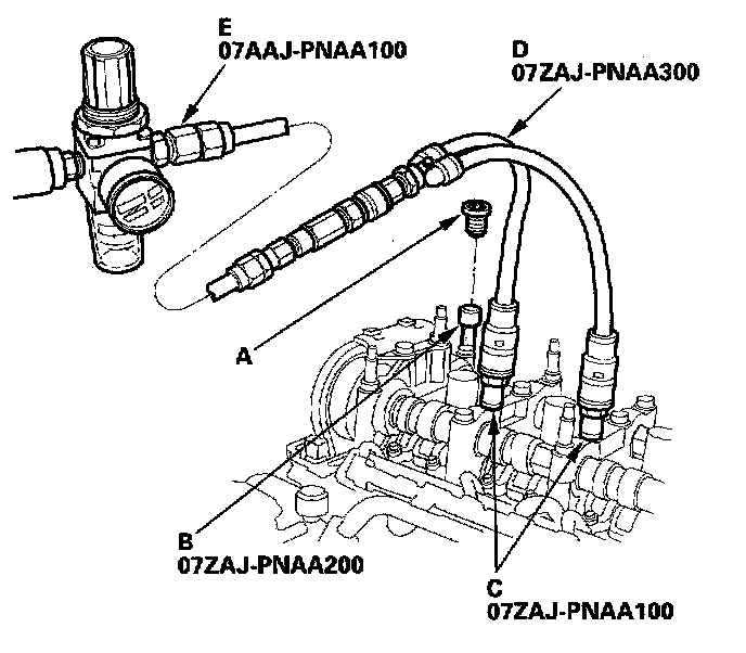 8. Remove the No. 2 and No. 3 camshaft holder bolts, and install the VTEC air adapters (C) finger-tight.