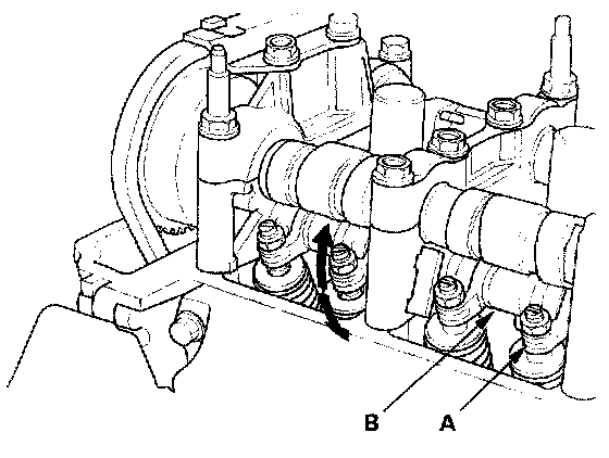 3. Verify that the intake primary rocker arm (A) moves independently of the intake secondary rocker arm (B).
