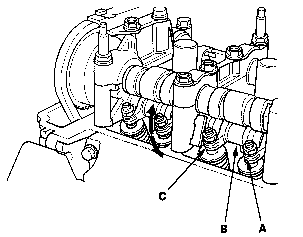 11. With the specified air pressure applied, move the secondary rocker arm (A) for the No. 1 cylinder. The mid rocker arm (B), primary rocker arm (C), and secondary rocker arm should move together.
