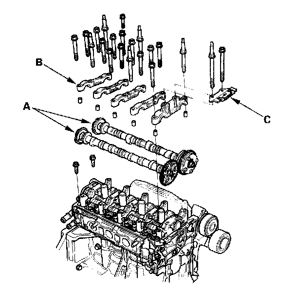 7. Set the camshaft holders (B) and cam chain guide B (C) in place.