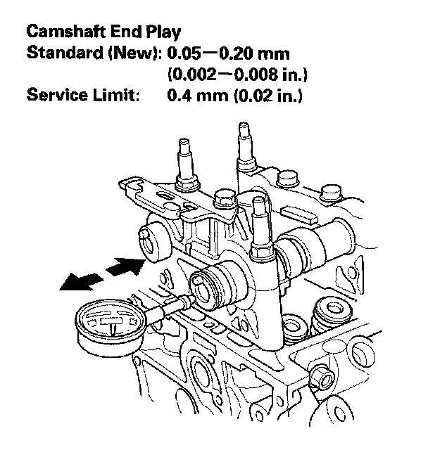 4. Zero the dial indicator against the end of the camshaft, then push the camshaft back and forth and read the end play. If the end play is beyond the service limit, replace the cylinder head and recheck. If it is still beyond the service limit, replace the camshaft.