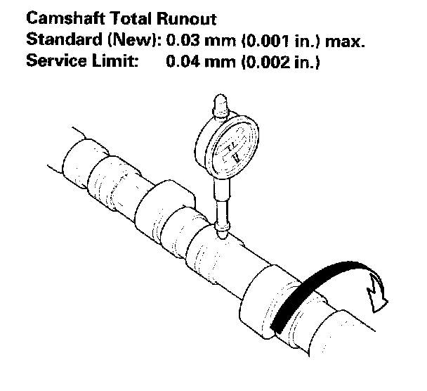 ^ If the total runout is beyond the service limit, replace the camshaft and recheck the camshaft-to-holder oil clearance. If the oil clearance is still beyond the service limit, replace the cylinder head.