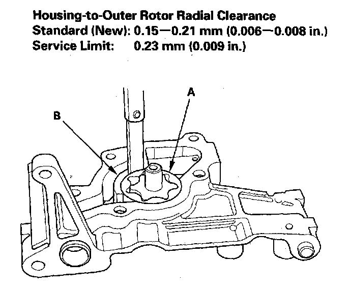 4. Check the housing-to-outer rotor radial clearance between the outer rotor (A) and pump housing (B). If the housing-to-outer rotor radial clearance exceeds the service limit, replace the oil pump.