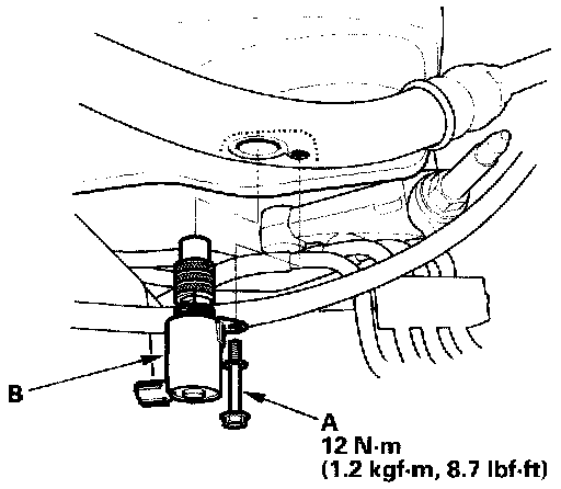2. Remove the bolt (A) and the VTC oil control solenoid valve (B).