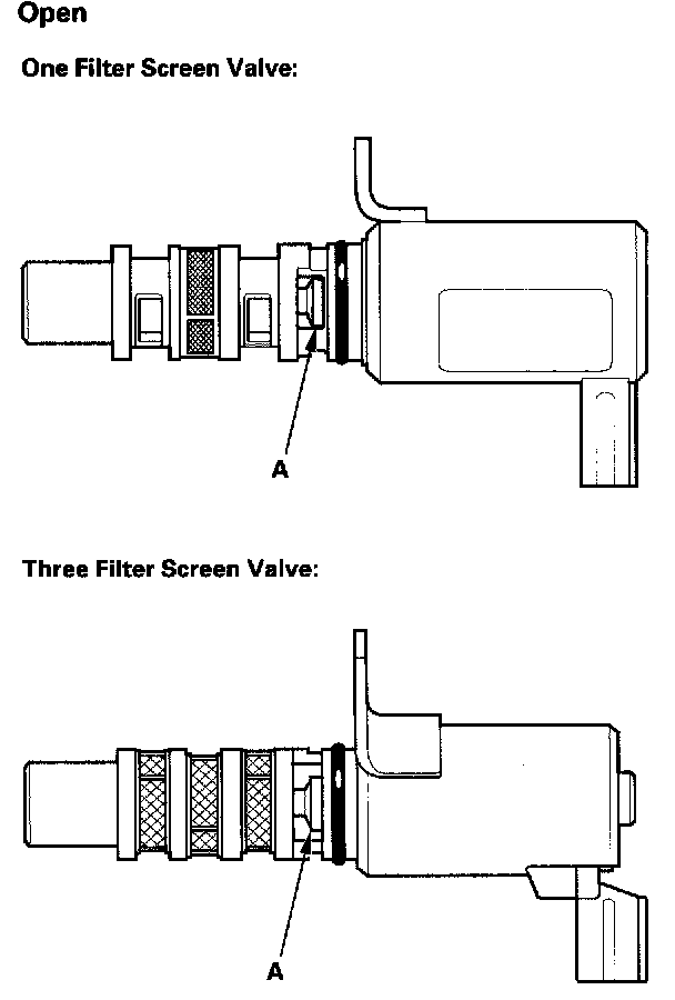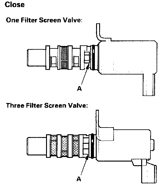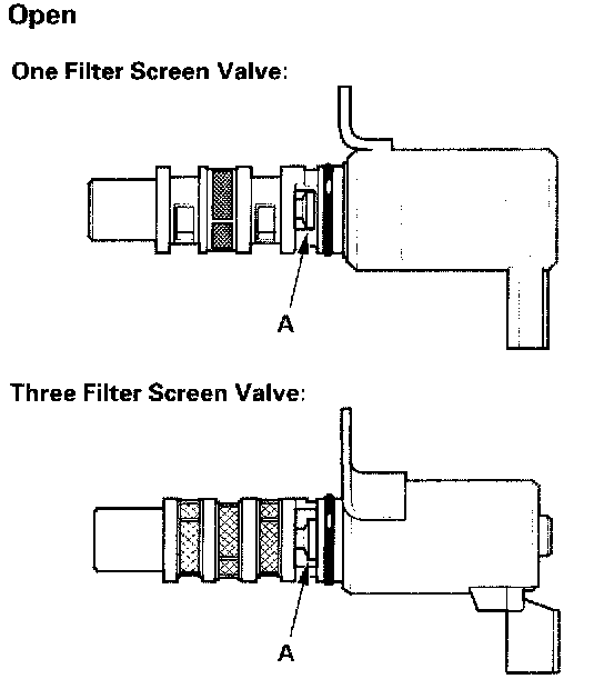 6. Connect the battery negative terminal to VTC oil control solenoid valve 2P connector terminal No.1. Appearance of inner valve (A) in the port should be at least 1.2 mm (1/16 in.). If the inner valve does not open, replace it; then go to step 7.