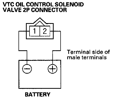 5. Connect the battery positive terminal to VTC oil control solenoid valve 2P connector terminal No.2.