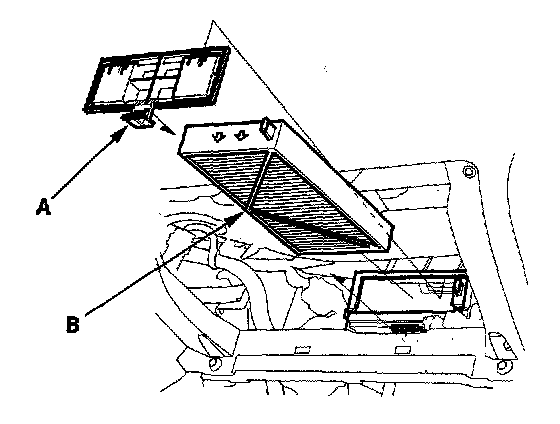2. Remove the filter lid (A) from the blower unit, then pull out the first dust and pollen filter (B). Slide the second filter to the left, and pull it out.