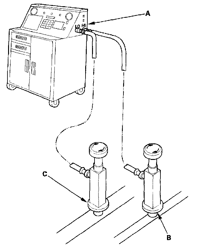 1. Connect a R-134a refrigerant recovery/recycling/charging station (A) to the high-pressure service port (B) and the low-pressure service port (C), as shown, following the equipment manufacturer's instructions.