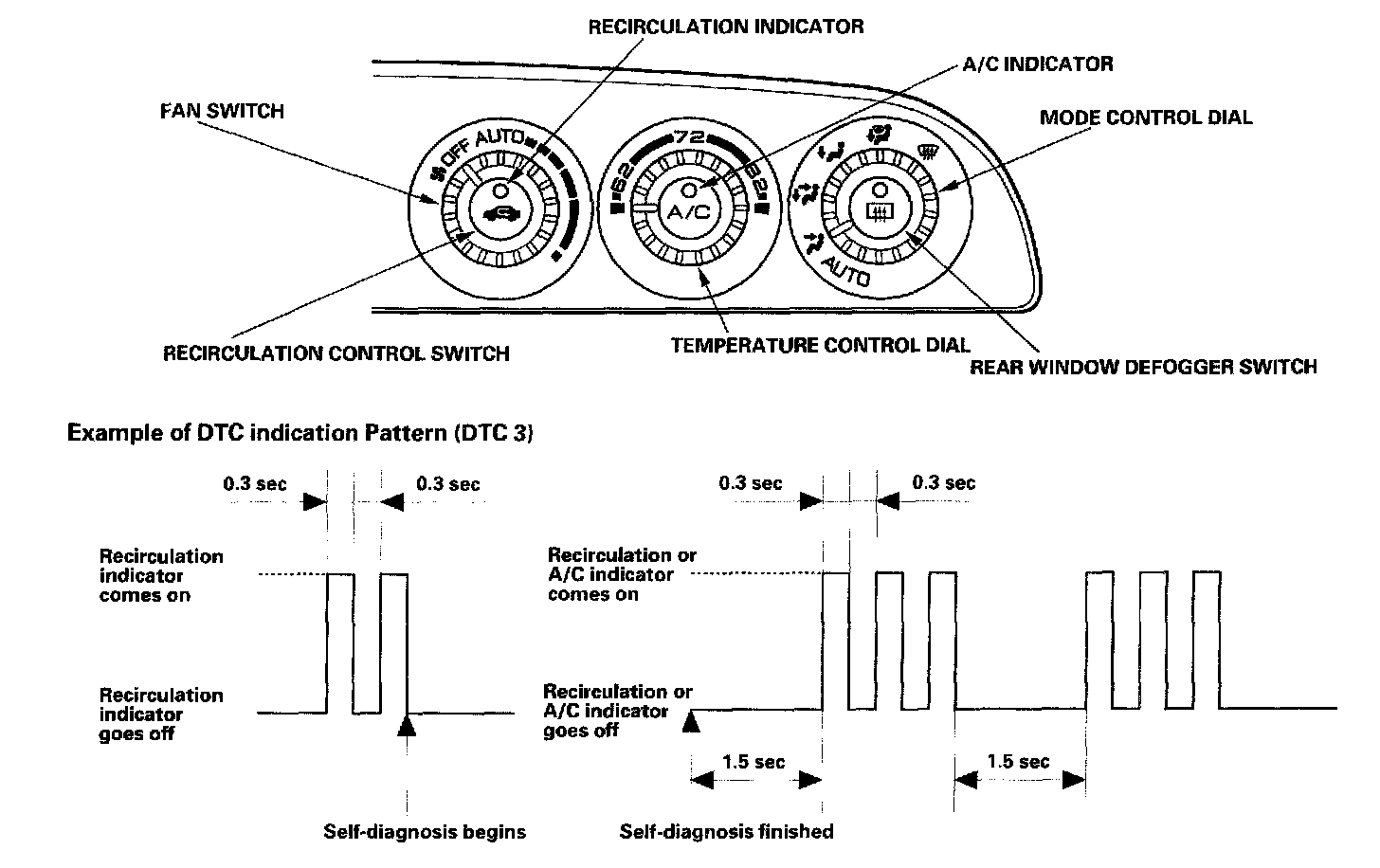 3. Turn the ignition switch ON (II), then press and hold the recirculation control switch. Within 10 seconds while holding the switch down, press the rear window defogger switch five times. The recirculation indicator blinks two times and the A/C indicator comes on, then the self-diagnosis will begin. About 15 seconds later, the self-diagnosis will finish and the A/C indicator goes off. If there is any problem in the system after finished self-diagnosis, the recirculation indicator will blink the Diagnostic Trouble Code (DTC) 1 through 13. When problems in the evaporator temperature sensor circuit are detected (codes 14 and 15), the A/C indicator will blink the DTC If no DTCs are found, the indicator will not blink.