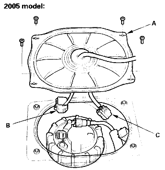 7. Disconnect the EVAP canister vent shut valve and fuel tank pressure sensor subharness 6P connector (C).