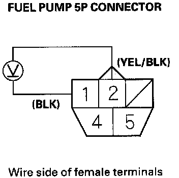 8. Measure voltage between the fuel pump 5P connector terminals No.1 and No.2 with the ignition switch ON (II). There should be battery voltage.