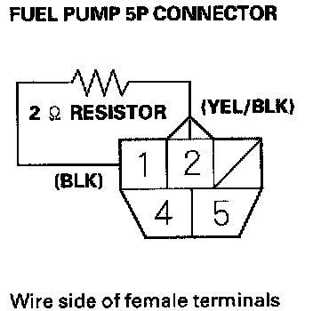 10. Install a 2 Ohm, resistor between the fuel pump 5P connector terminals No.1 and No.2, then turn the ignition switch ON (II).