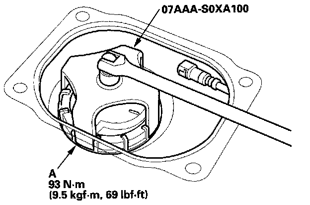 15. Using the special tool, loosen the fuel tank unit locknut (A).