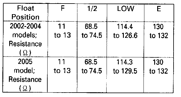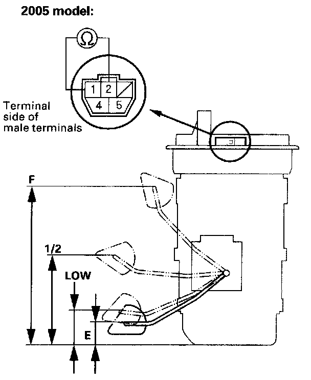 16. Measure the resistance between the No.1 and No.2 terminals with the float at E (EMPTY), 1/2 (HALF FULL), and F (FULL) positions. If you do not get the above readings, replace the fuel gauge sending unit.