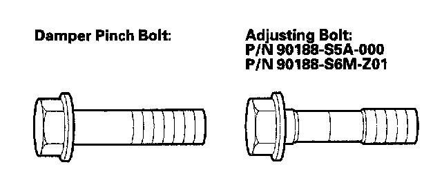 NOTE: The camber angle can be adjusted up to ±15' (center of tolerance) by replacing one damper pinch bolt with the adjusting bolt. The camber angle can be adjusted up to ±30' by replacing both upper and lower damper pinch bolts with the adjusting bolts.