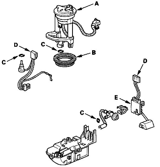 - When installing the fuel gauge sending unit (E), make sure the connection is secure and the connector is firmly locked into place. Be careful not to bend or twist it excessively.