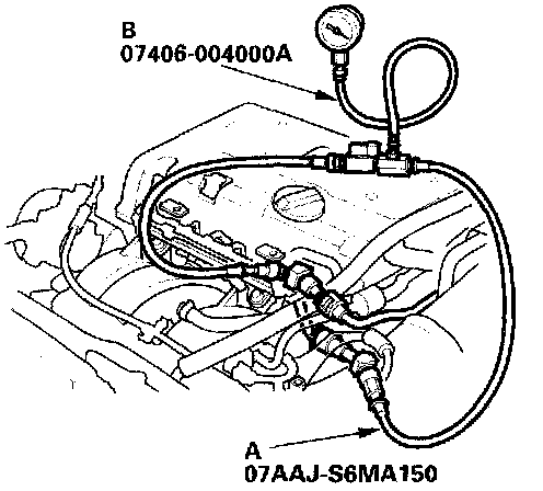 Attach the fuel pressure gauge attachment set (A) and the fuel pressure gauge (B) to the fuel line as shown.