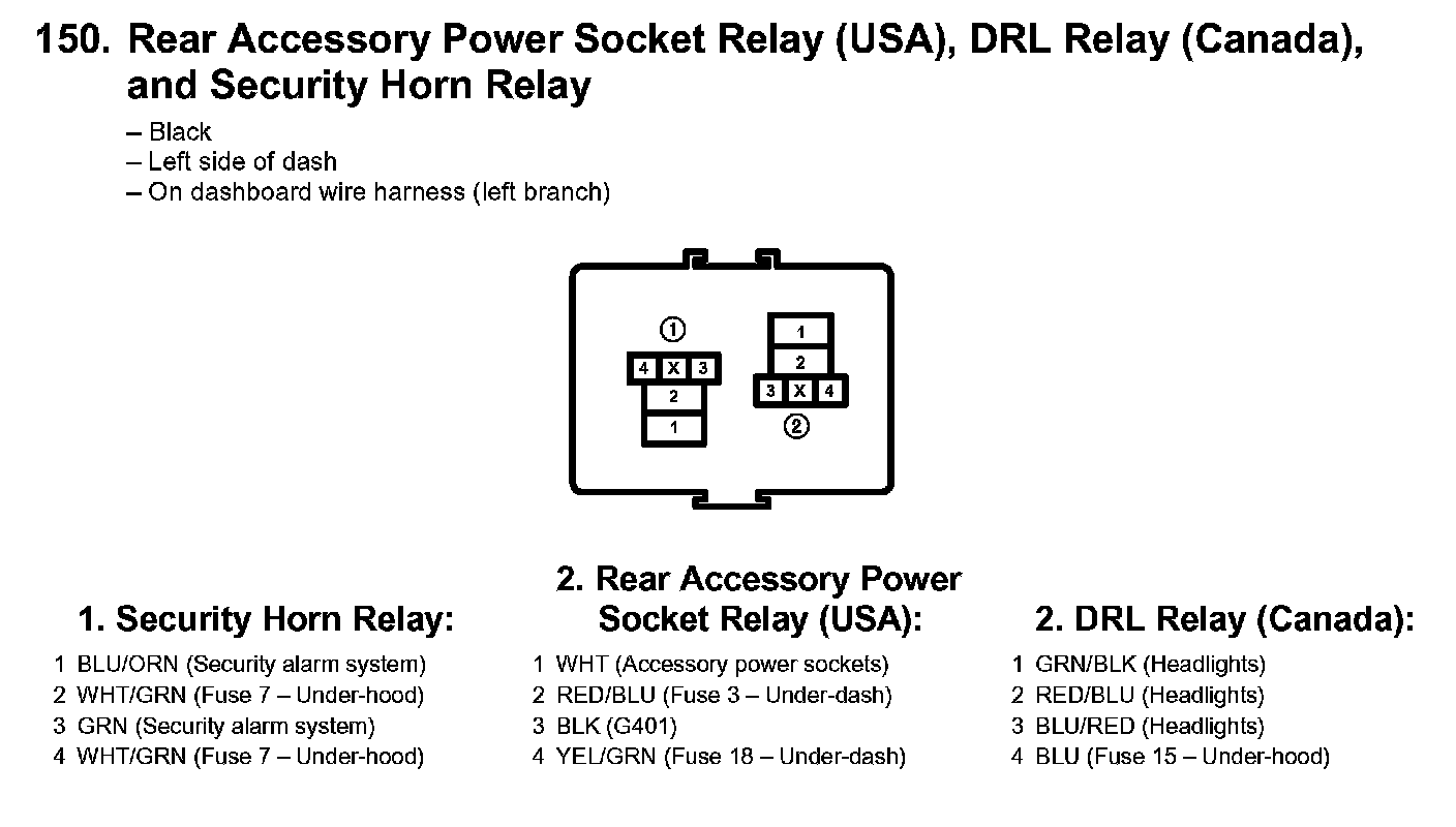 150. Rear Accessory Power Socket Relay (USA), DRL Relay (Canada), And Security Horn Relay: