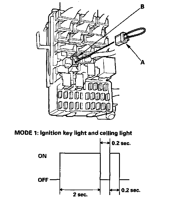 6. After about 5 seconds, the ignition key light and ceiling light should come on for 2 seconds, go out, then blink on for 0.2 second to show the system is now in Mode 1.