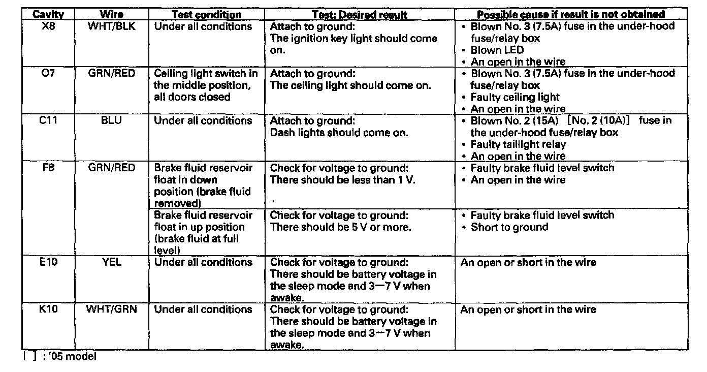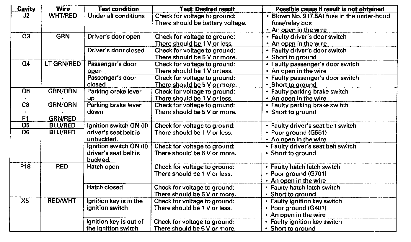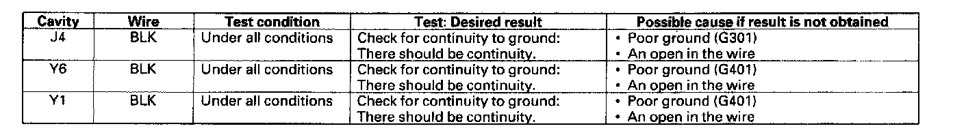 5. Reconnect the connectors to the under-dash fuse/relay box, and make these input tests at the appropriate connectors on the under-dash fuse/relay box.