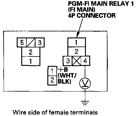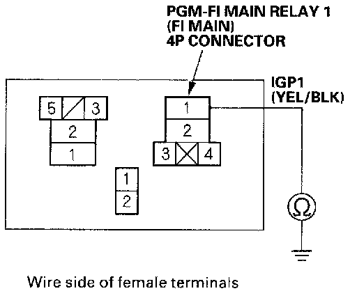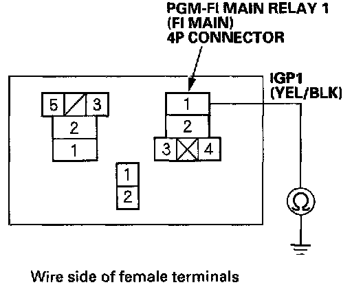 31. Check for continuity between body ground and the PGM-FI main relay 1 (FI MAIN) 4P connector terminals No.2 and No.4 individually.