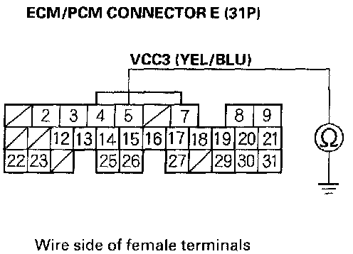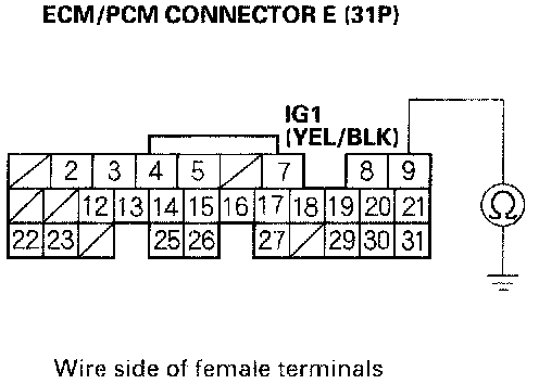 15. Check for continuity between ECM/PCM connector terminal E31 and body ground.