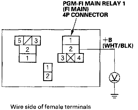 63. Measure voltage between PGM-FI main relay 1 (FI MAIN) 4P connector terminal No.2 and body ground.