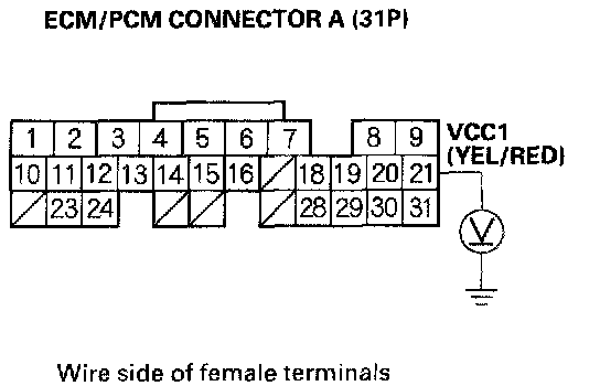 69. Disconnect the connector from each of these sensors, one at a time, and measure voltage between body ground and ECM/PCM connector terminal A21 with the ignition switch ON (II).