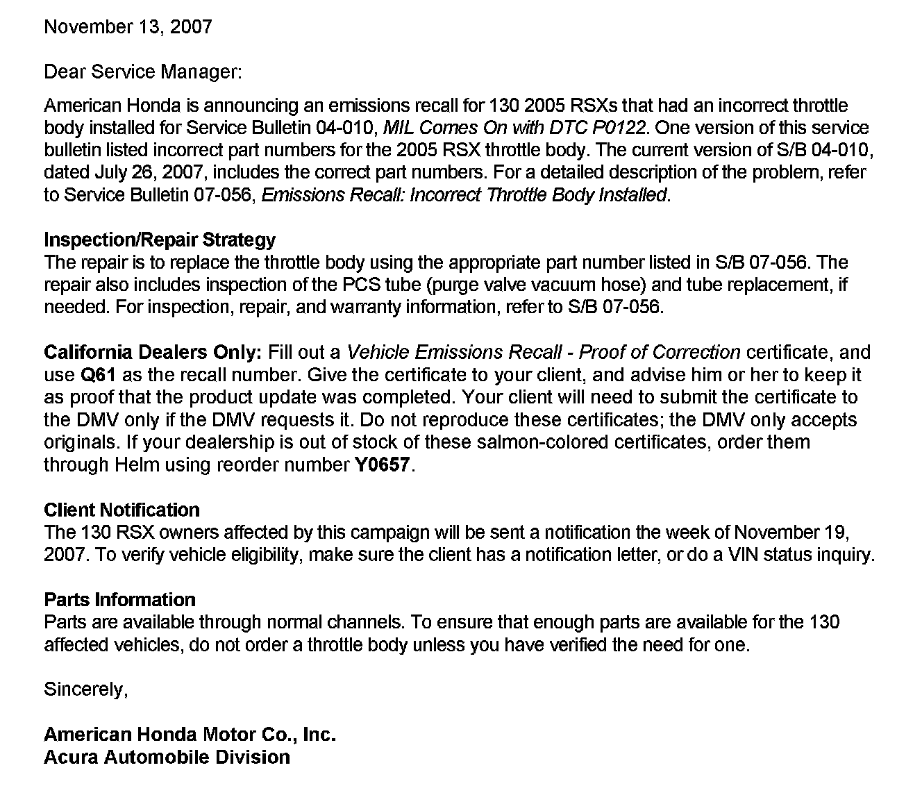 Recall - Throttle Body Replacement