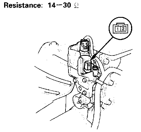 2. Measure resistance between VTEC solenoid valve connector terminals No.1 and No.2.